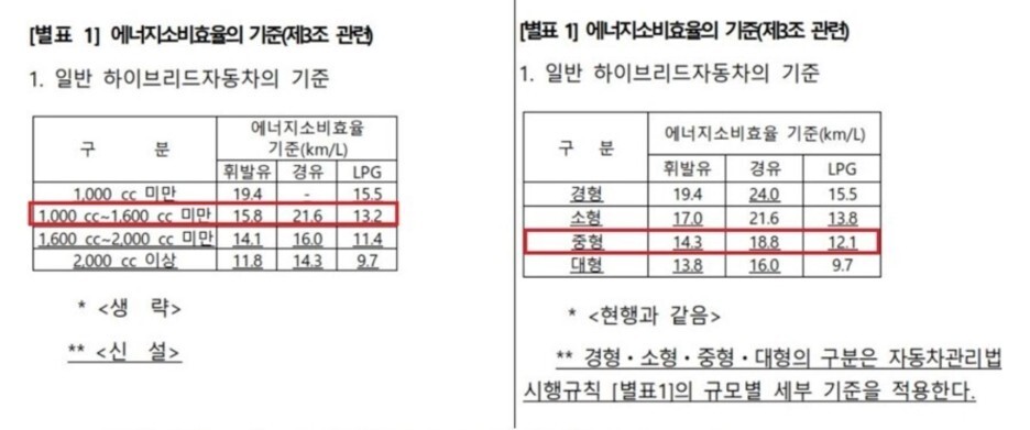 현행법상 중형차량은 14.3km/L의 연비를 충족해야 하이브리드 친환경 차량의 혜택을 받을 수 있습니다.