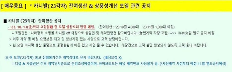 내부 공문에는 중요한 정보들을 볼 수 있는데, 현재 카니발의 생산 일정. 카니발 페이스리프트의 상품성 출시 일정이 표기되어 있습니다.