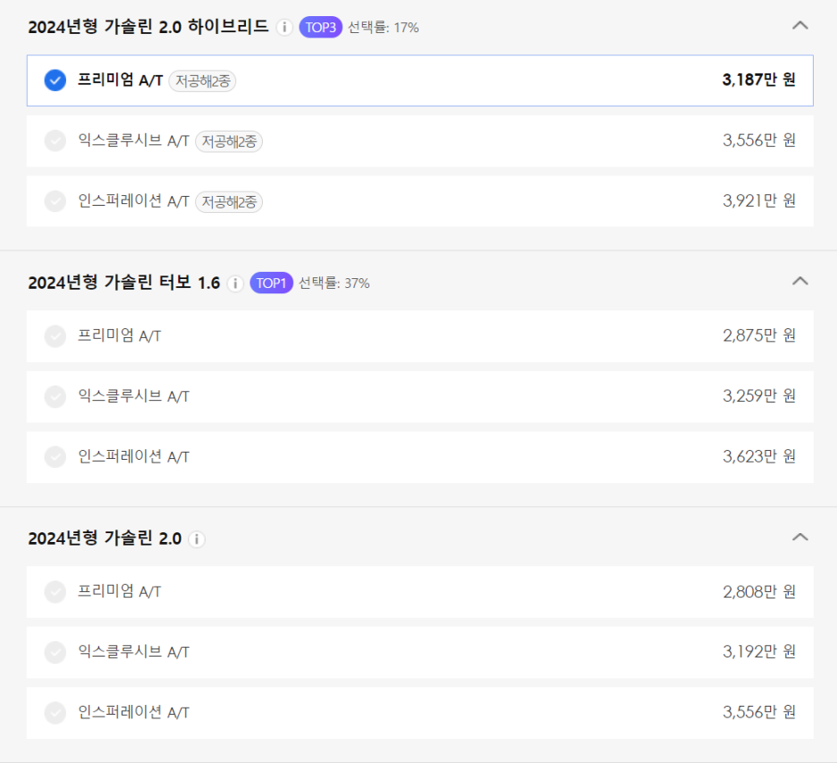 그런데 많은 분들이 조심할 것이 있어요! 가솔린 1.6 엔진과 가솔린 2.0 엔진의 가격을 보면 2.0이 더 저렴하죠?