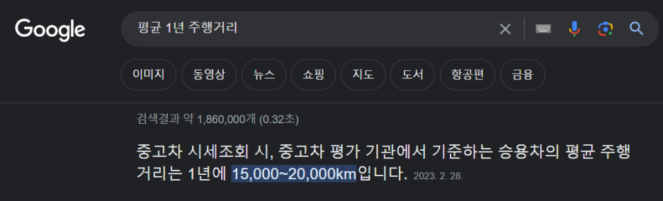 대한민국 평균 1년 자동차 주행거리 15000~2000km입니다.