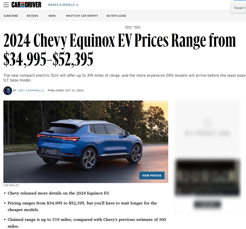 이쿼녹스 EV 미국 시작 가 격은 최종 3만4995달러(약 4700만원)로 확정되었습니다.