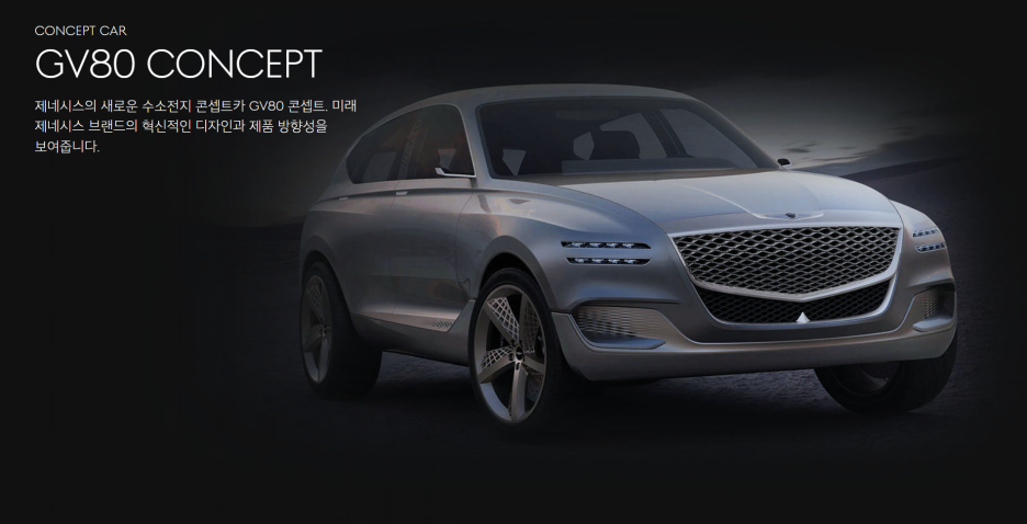 두번재 콘셉트는 GV80이었죠? 제네시스 브랜드에서 SUV를 선보인다는 것이 확인되었고, GV80은 내연기관으로 출시가 되었지만, 콘셉트는 수소전기차로 소개가 되었습니다.