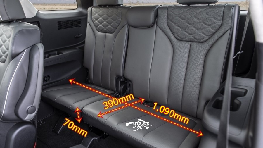 그런데 1열 2열 3열 모두 힙룸 사이즈를 개선했습니다. 특히 2열의 경우 힙룸이 43mm나 개선되었기 때문에 2열을 중점적으로 개선했네요!