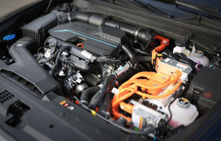 하이브리드 차량의 엔진룸을 이렇게 주황색 색상의 케이블로 구분되어 있기 때문에 하이브리드 차량임을 쉽게 인지할 수 있습니다.