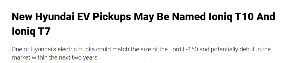 제목이 인상적이죠? 새로운 현대 EV 픽업트럭은 아이오닉 T10으로 명명했고, 포드 F150 크기에 2년 이내에 시장에 데뷰한다는 것이죠!