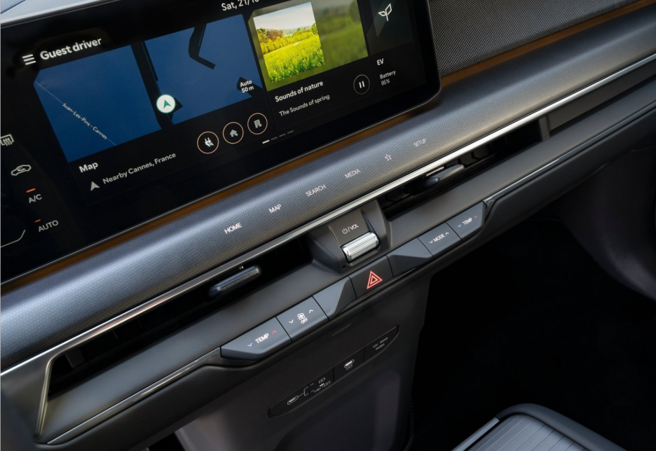 EV9의 공조기는 통합형 디스플레이 아래에 터치식으로 기능들이 배치되어 있으며 하단에 송풍구가 제공됩니다.