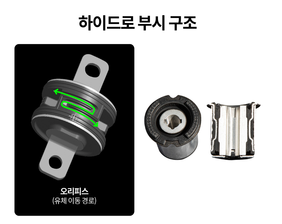 강성은 높은 고무 부시가 일반적으로 적용되는데 강성이 높으면 딱딱해서 승차감을 저해하기 되고, 반대로 부드러운 고무 부시를 적용하면 충격을 부드럽게 처리하지만 무른 물성으로 인해서 여진감이 남게 됩니다.