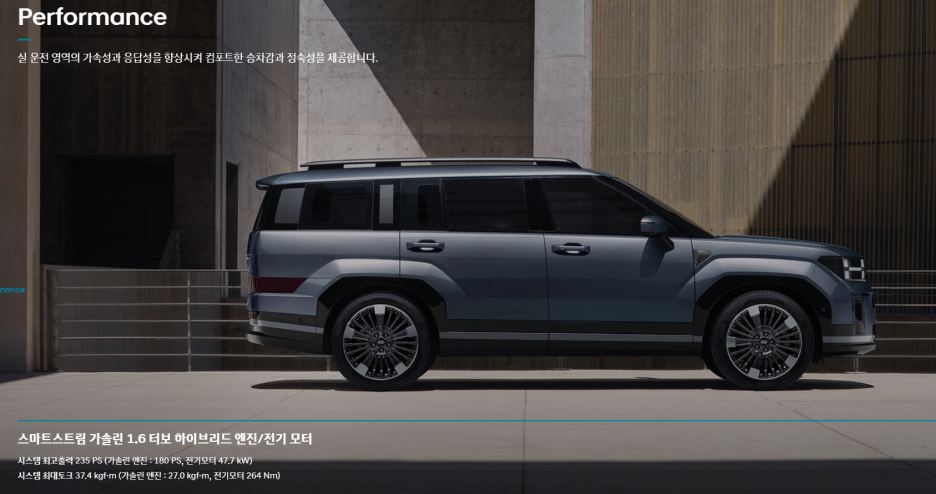 국내 중형 SUV를 대표하는 싼타페나 쏘렌토의 경우 1.6 가솔린 엔진이 180마력, 전기모터가 48마력을 제공하기 때문에 시스템 합산 출력은 235마력이 되죠? 차이점은 지리가 만든 하이브리드 시스템 출력이 10마력 정도 더 높다고 할 수 있습니다.