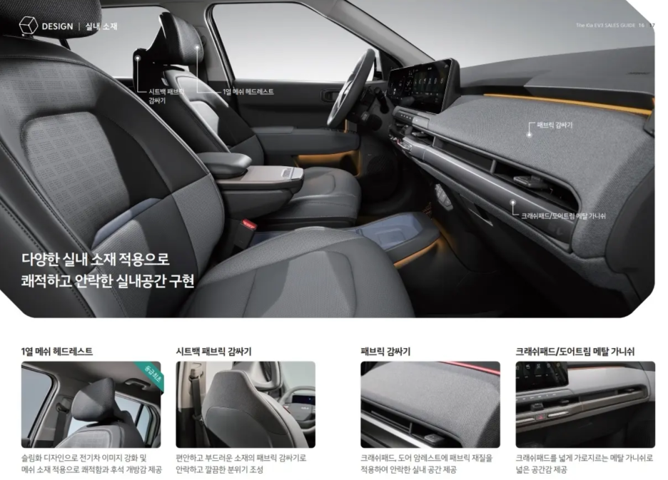 패블릭 소재를 적극 활용하면서 안락하고 편한 느낌의 실내 공간을 제공합니다. 실물로 본 제 느낌은 글쎄요! 가격까지 고려해 보면 EV9 보다도 EV3쪽에 만족도가 높다고 할까요?