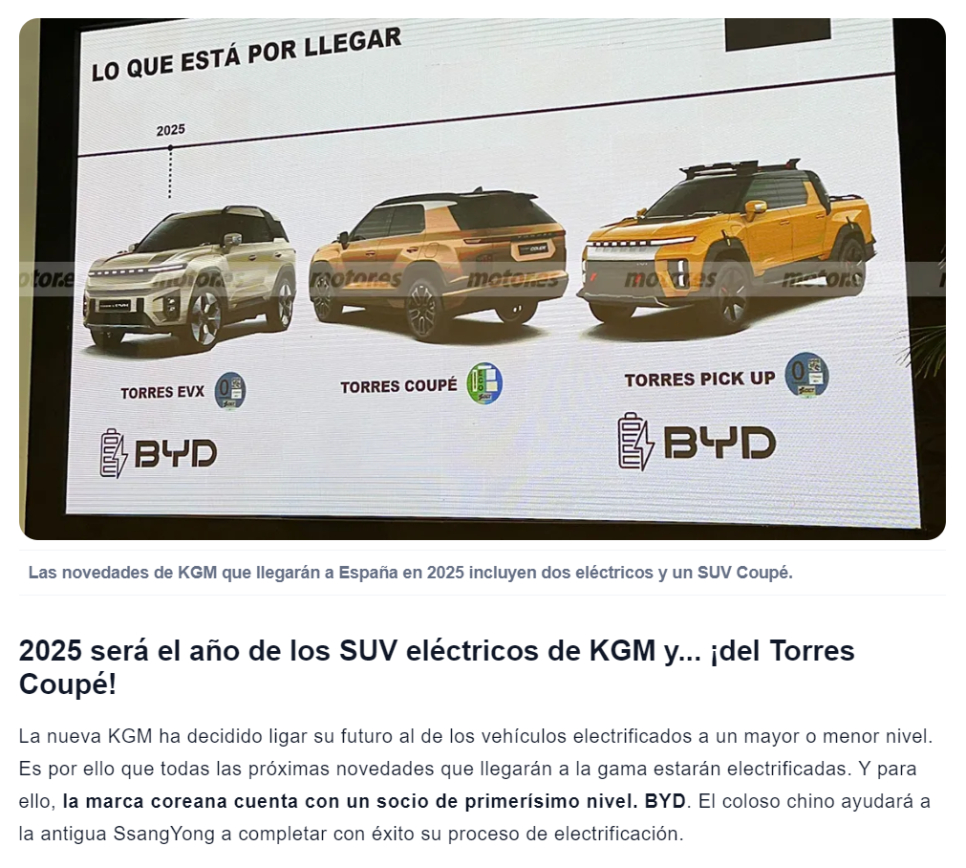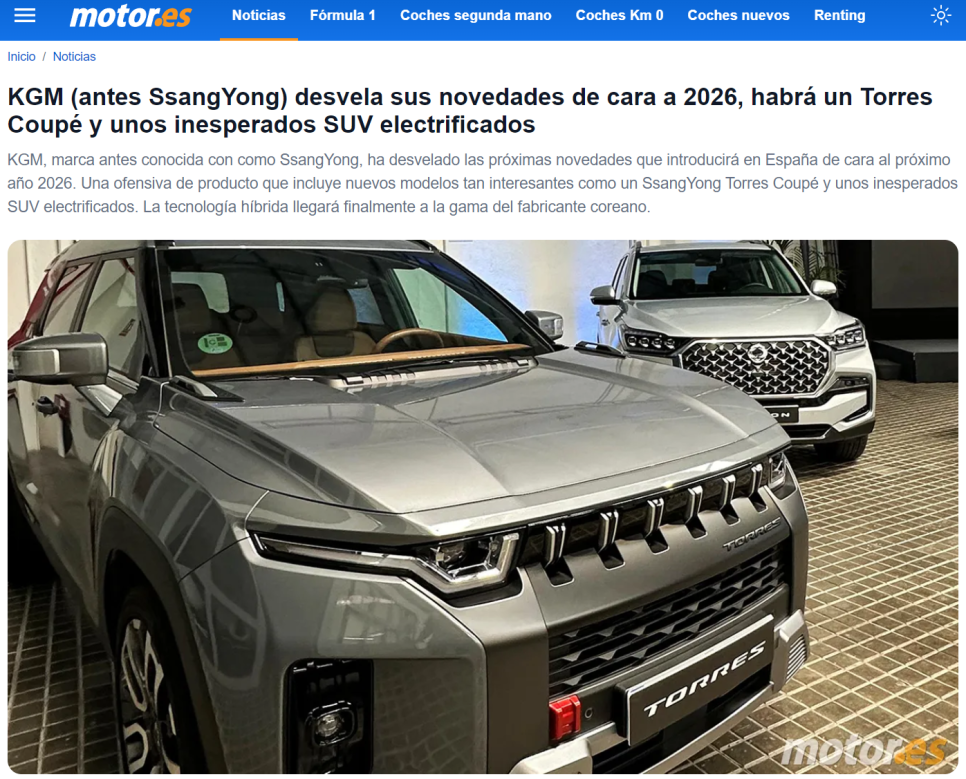 기사 원문의 내용을 보면 2025년도에 스페인에 도착한 KGM 신제품에는 전기차 2대와 SUV 쿠페가 포함되어 있다고 합니다.