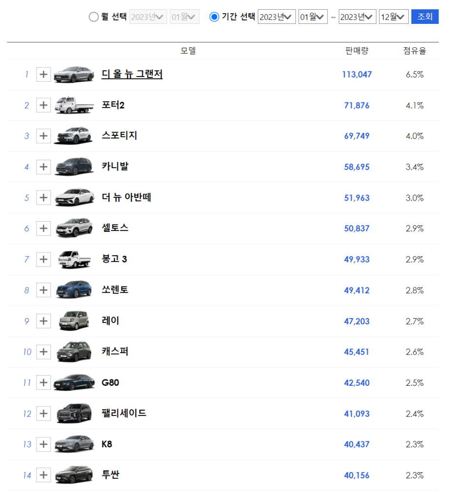 언제나 1위는 그랜저이죠? 그리고 2위는 자영업자를 대표하는 포터가 차지했구요!