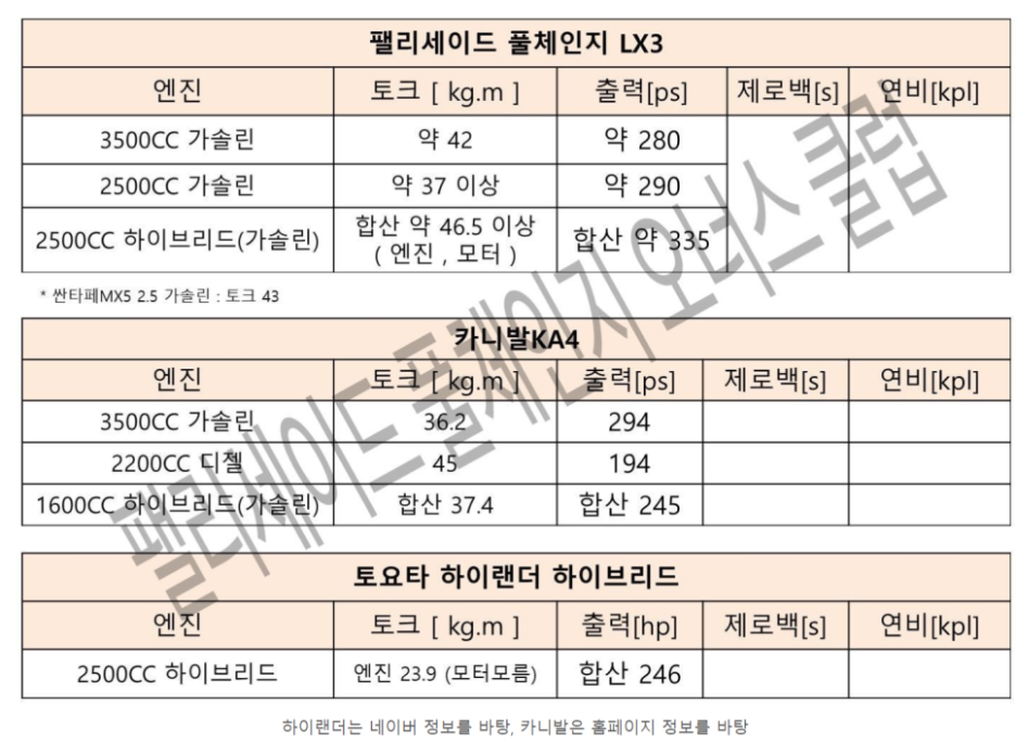 팰리세이드 풀체인지 오너스 클럽에 따르면, 차세대 하이브리드의 스펙은 무려 335마력을 발휘한다고 합니다.