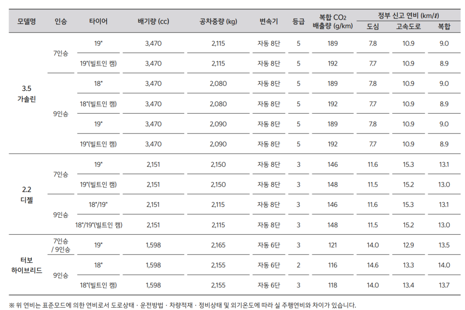 8단 DCT와 조합되어서 2륜 기준 복합 연비는 11km/L 인데, 신형 팰리세이드의 경우 싼타페 보다는 더 크고 공차중량도 더 무겁기 때문에 동일한 2륜 기준이라고 해도 예상 정보를 보면 복합 연비 기준으로 약 0.5km/L의 연비 차이가 있습니다.