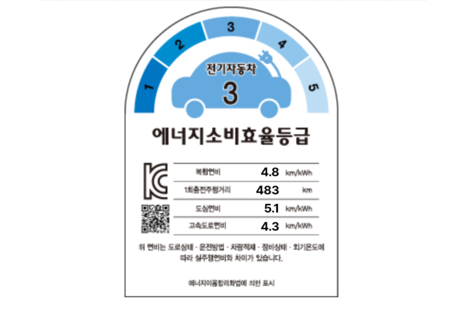 전기차에서 가장 중요한 주행거리는 483km이며, 도심연비 5.1 고속도로 연비 4.3으로 복합연비는 4.8입니다.