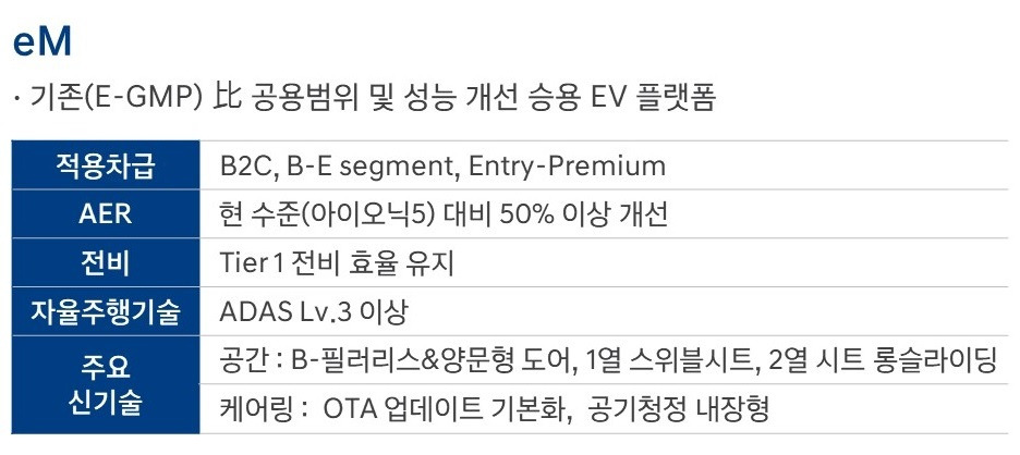 다음 플랫폼은 #eM 과 #eS 플랫폼 으로 이원화 해서 승용차 라인업과 화물차 PBV 를 나눠서 비용을 대폭 낮추고 효율을 끌어올리겠다는 것이 새로운 플랫폼의 도입 이유입니다.