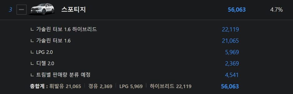 준중형 SUV 1위 스포티지는 올해 56063대가 판매되었습니다. 여기에 22119대가 하이브리드로 판매되었습니다.
