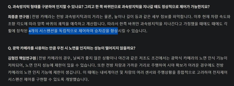 특히 전자제어 서스펜션은 4개 서스펜션을 독립적으로 제어할 수 있기 때문에.. 코너링이나 롤링과 피칭을 줄일 수 있는 기능입니다.