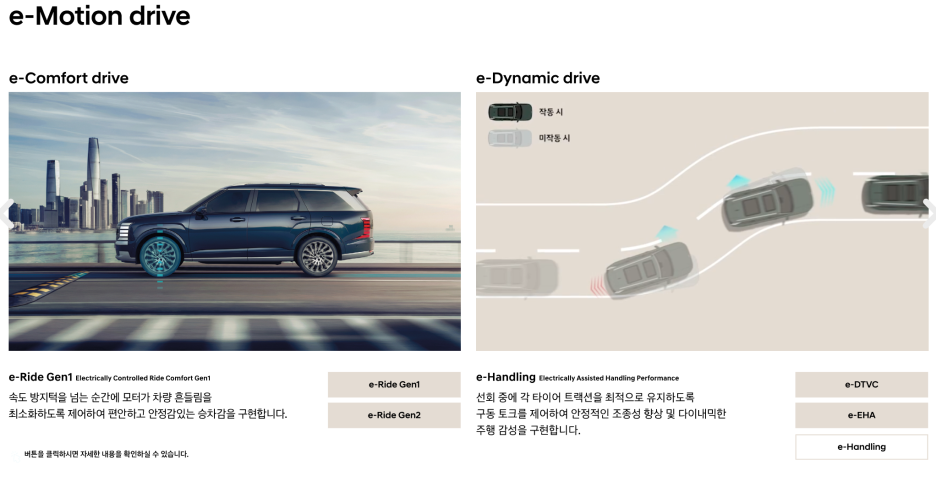 하이브리드 차량에 e 모션 드라이브 기술은 전기 모터와 브레이크 제어를 통해서 승차감과 핸들링을 개선하는 기술입니다.