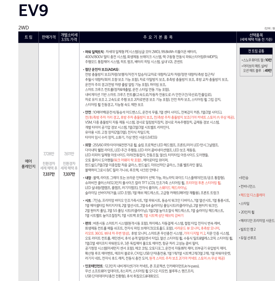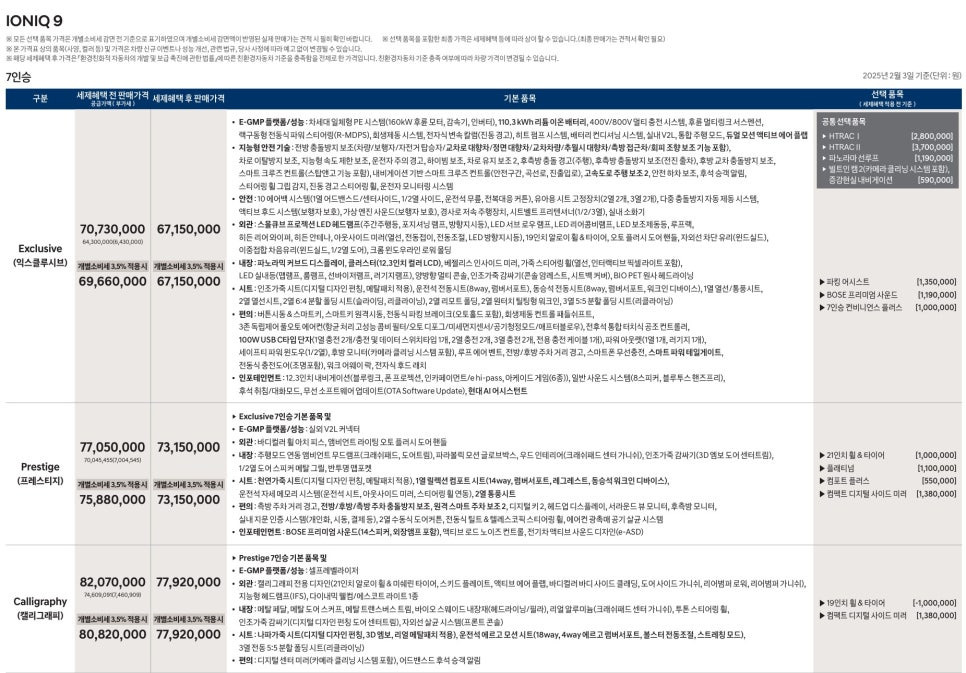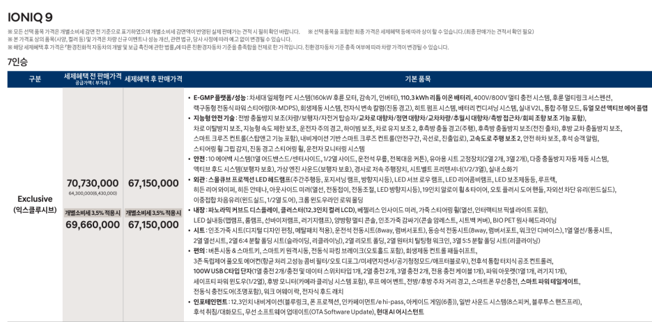 따라서 아이오닉9은 기본 트림 익스클루시브에 몇 가지 옵션을 추가하고 보조금을 적용한다면, 진짜 6천만원대에 구입할 수 있는 7인승 전기 SUV가 될 것 같습니다.