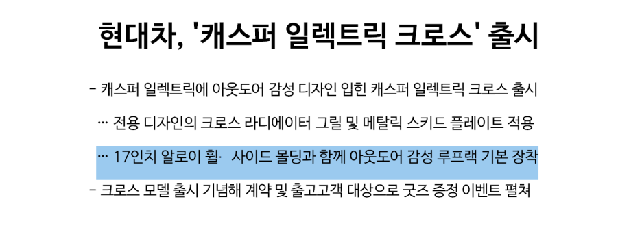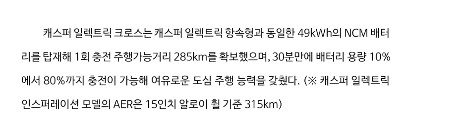 먼저 하이라이트를 보면 감성 디자인 입힌 캐스퍼 일렉트릭 크로스 출시라고 하는데..