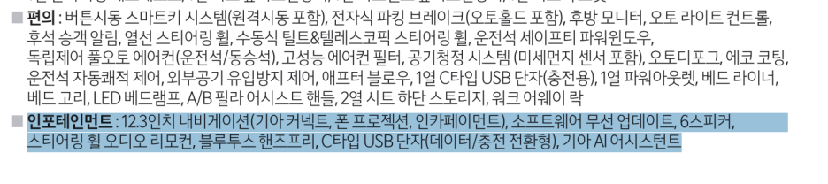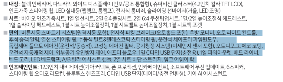■시트 : 운전석 파워시트, 1열 통풍시트, 운전석 전동식 허리지지대, 2열 열선시트, 2열 6:4 슬라이딩 연동 리클라이닝시트, 2열 센터 암레스트, 1열 시트백 하드 커버&듀얼 포켓 ■편의 : 하이패스 자동결제 시스템(e hi-pass 기능 포함), 컬럼 타입 전자식 변속 레버, 패들 쉬프트, 스마트폰 무선충전 시스템(듀얼), 레인센서, 2열 에어벤트, 1열 시트백 C타입 USB 단자(충전용), 사이드 스토리지