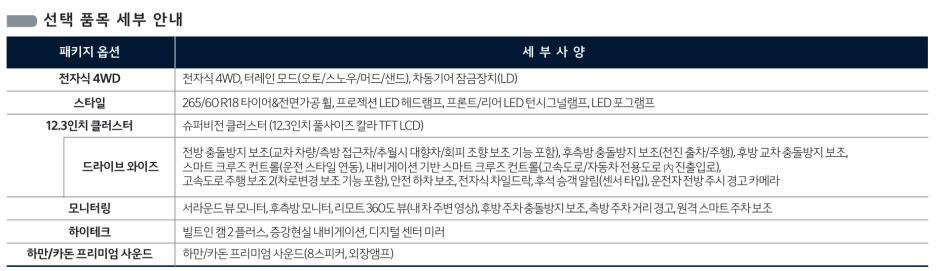 ■내장 : 블랙 인테리어 또는 브라운 인테리어 선택 가능, 슈퍼비전 클러스터(12.3인치 풀사이즈 칼라 TFT LCD), 폴딩 콘솔 테이블, 1열 메쉬 헤드레스트