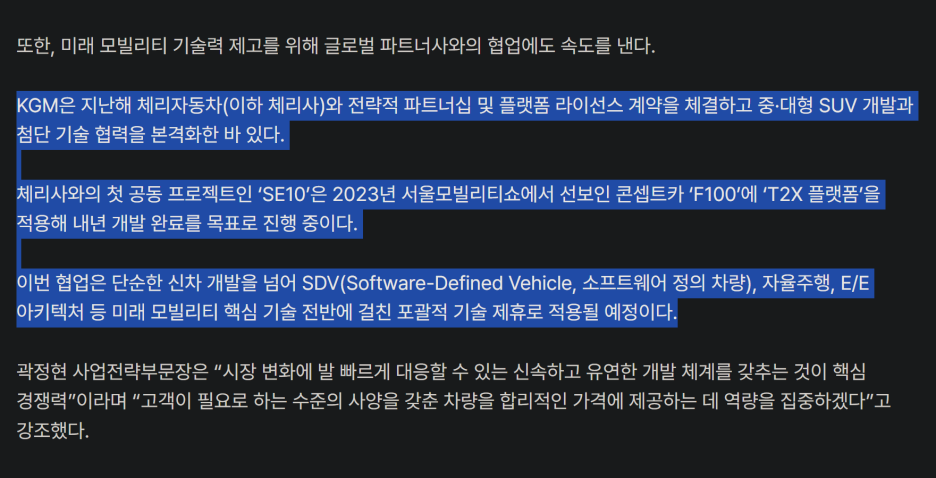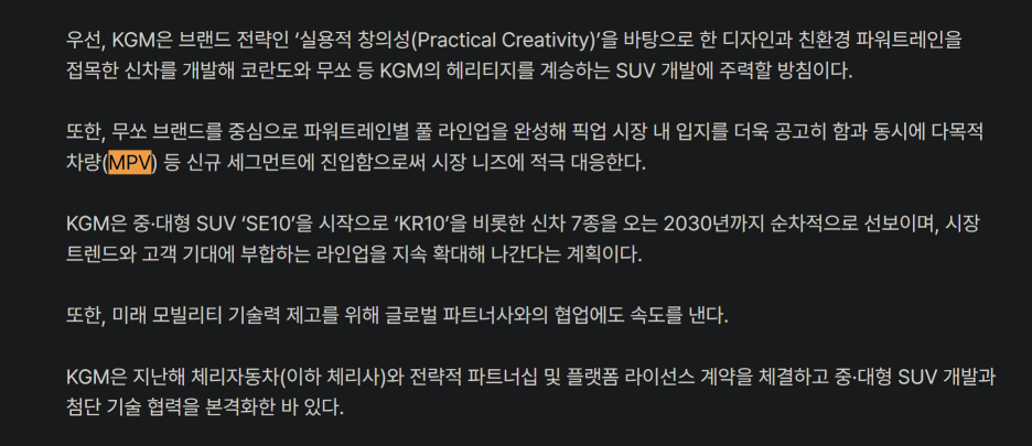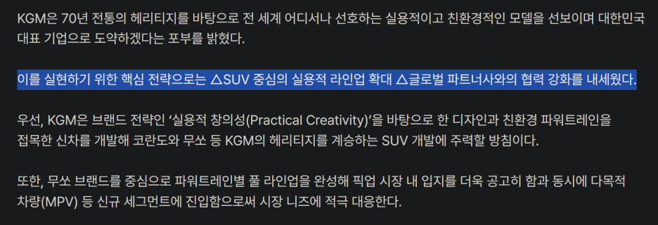현재 상황에서 냉정하게 본다면 KGM은 글로벌 시장에 판도를 바꿀만큼 큰 영향력을 가지고 있지 않으며, 기술력 관점에서도 신기술 빠르게 갖추기도 힘든 상황입니다.