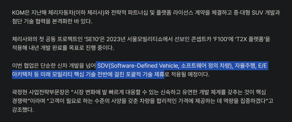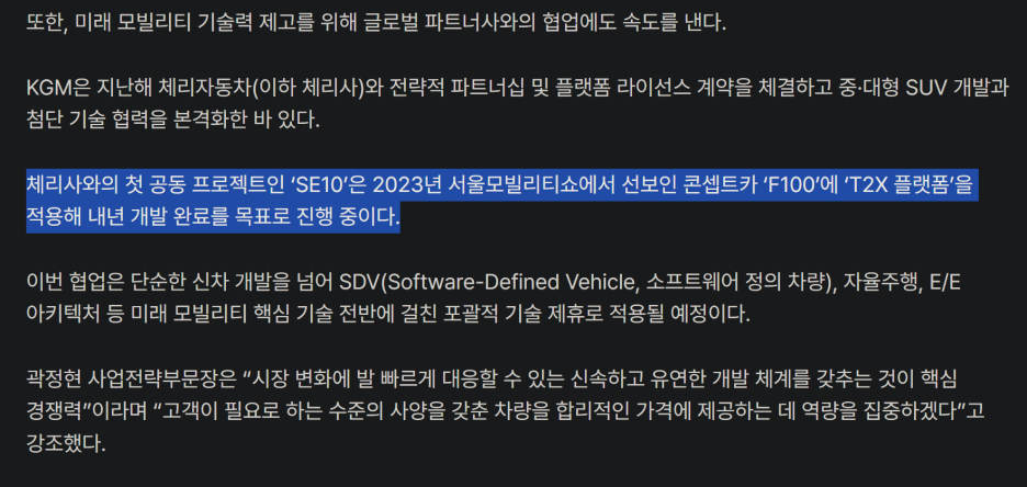 이유는 기술을 제휴하게 될때 단순히 기술만 제공하는 것이 아닌, 유지보수도 포함되죠? 따라서 이런 점을 고려해 본다면 향후 KGM은 BYD 그리고 체리자동차와 이중화 전략으로 협력을 강화하게 될 것 같습니다.