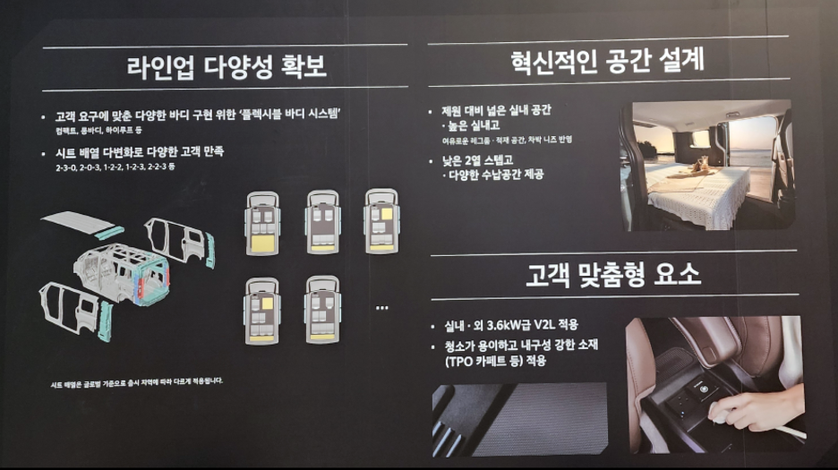 EGMP.S 플랫폼위에 블럭과 같이 구성해 놓았기 때문에 다양한 차량을 만들수 있으며, 또한 사고가 발생되어서 외장 부품을 교체할때에도 비용적으로 저렴한 획기적인 기술이 적용되었습니다.