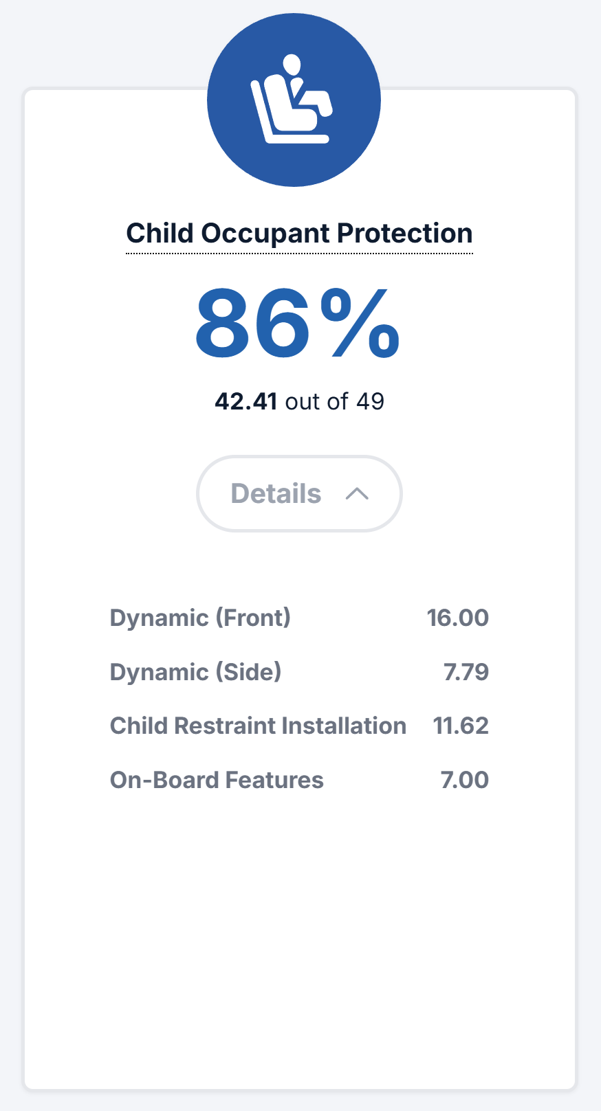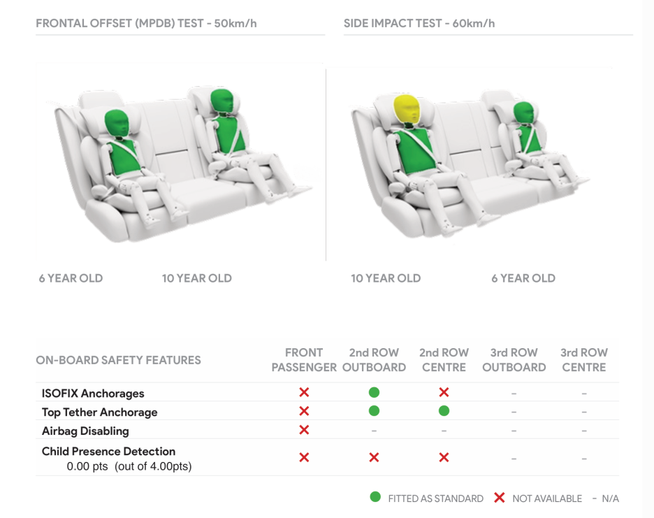 결과를 보면 정면 충돌 테스트에서 2열에 앉은 6세와 10세 어린이의 부상은 모두 굿 등급으로 좋은 평가를 받았습니다.