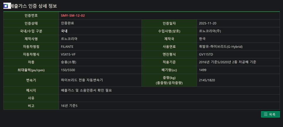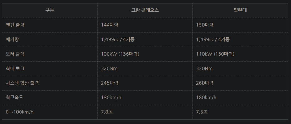 시스템 합산 출력이 중요한데.. 그랑 콜레오스가 245마력 오로라2 필랑트의 경우 환경부 인증 내용을 기반으로 보수적으로 봤을 때 260마력 이상을 예상해 볼 수 있습니다.