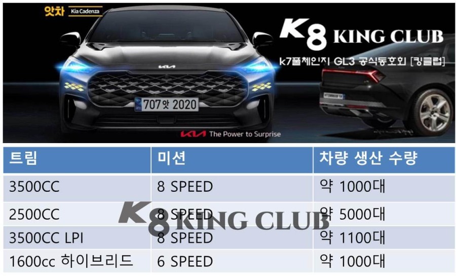 K8KING CLUB에 의하면, 4가지 엔진 중에서 주력 엔진으로 예상되는 2.5 가솔린의 경우 5000대가 생산되며,