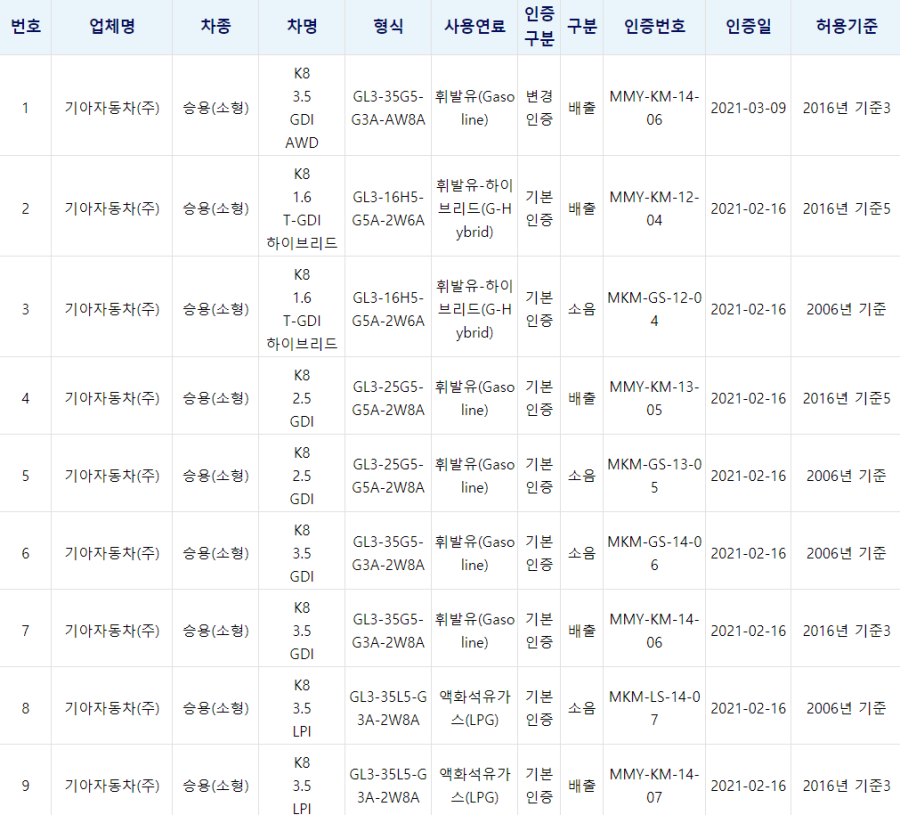 인증받은 내용을 보면 K8 3.5 GDI AWD라고 표기가 되어 있습니다.