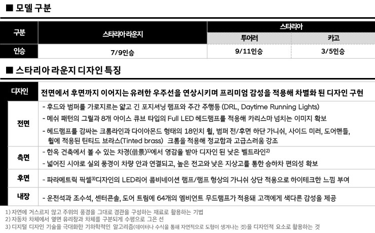 놀라운 점은 루프와 필러 쪽 내장재 소재는 스웨이드로 예상되는데, 스타리아에 높은 감성을 적용하기 위한 노력으로 예상되는데 가격은 높아지겠지만 프리미엄 미니밴을 원하는 소비자에게 충분히 어필할 수 있을 것 같네요!
