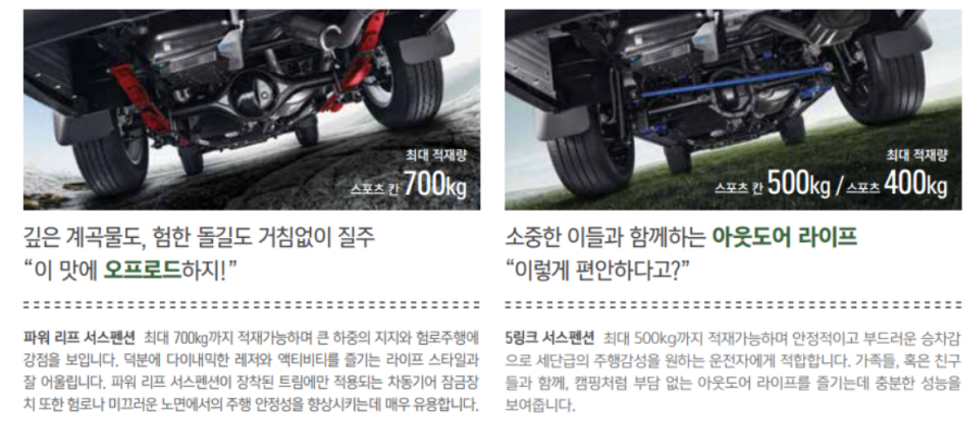 리프 서스펜션은 큰 하중의 지지하기 때문에 레저 등의 목적으로 무거운 짐을 수납해야 한다면 700kg까지 적재 가능한 리프 서스펜션을 선택하시면 됩니다.
