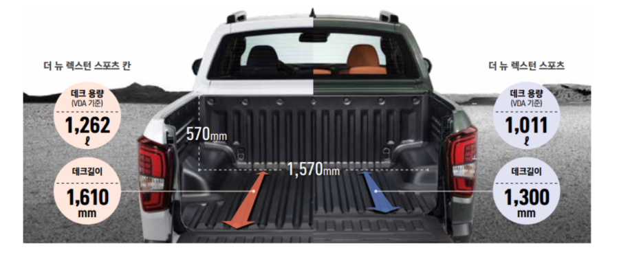 데크 길이는 스포츠가 1300mm, 칸은 1610mm입니다. 만약 테일게이트 펼치고 차박 등을 고려하시다면, 칸은 1610mm에서 50cm 이상이 추가되면서 키가 큰 성인분들도 누울 수 있는 사이즈가 나옵니다.
