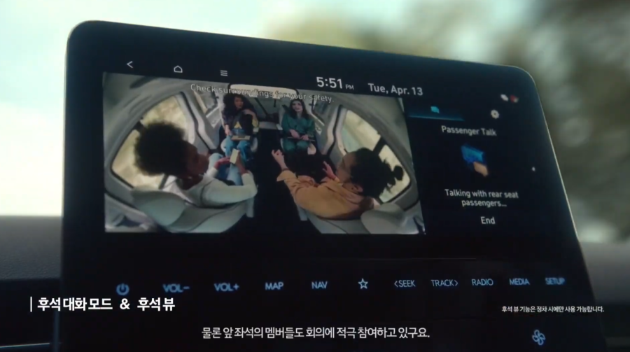 1 열 조수석에 탑승한 사람도 고개만 살짝 돌리면 대화에 참석이 가능하며, 운전자는 고개를 돌리지 않아도 인포테인먼트를 통해서 볼 수 있습니다.