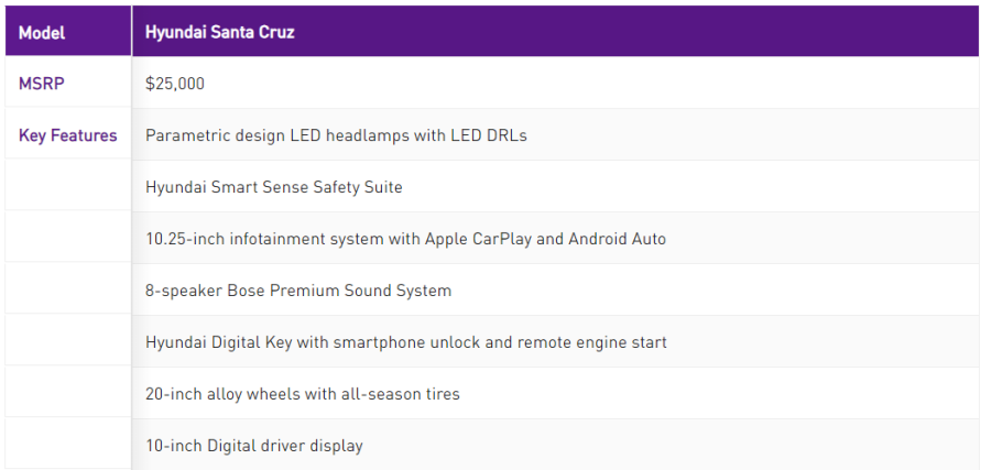싼타크루즈의 엔진 스펙은 2.5 자연흡기와 2.5 터보차저가 조합된 엔진 2가지로 제공되며, 190마력과 275마력이 제공됩니다.