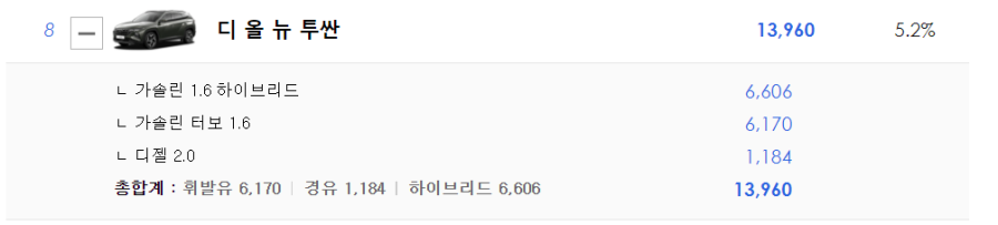 지난해 출시한 투싼의 경우 거의 절반이 하이브리드 차량이 가 판매되었습니다.