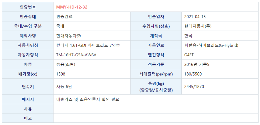 드디어 싼타페 하이브리드 차량의 엔진 인증이 확인되었습니다.