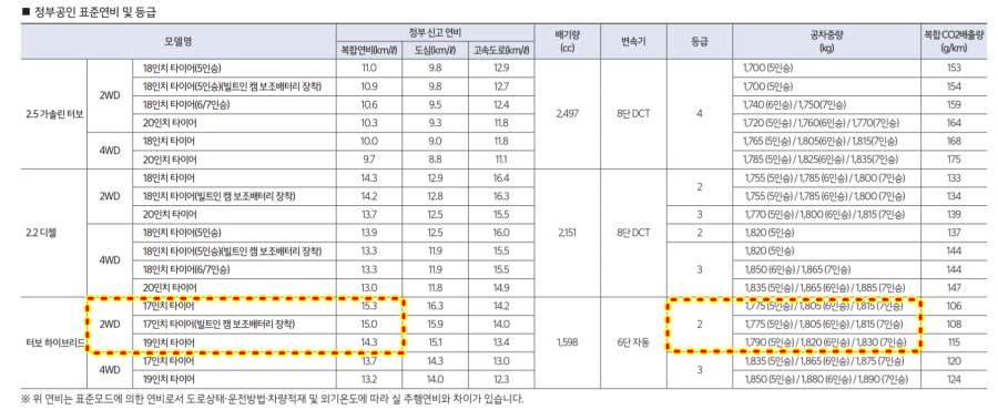 쏘렌토 차량의 연비표입니다. 여기서 하이브리드 차량만 보시면 됩니다.