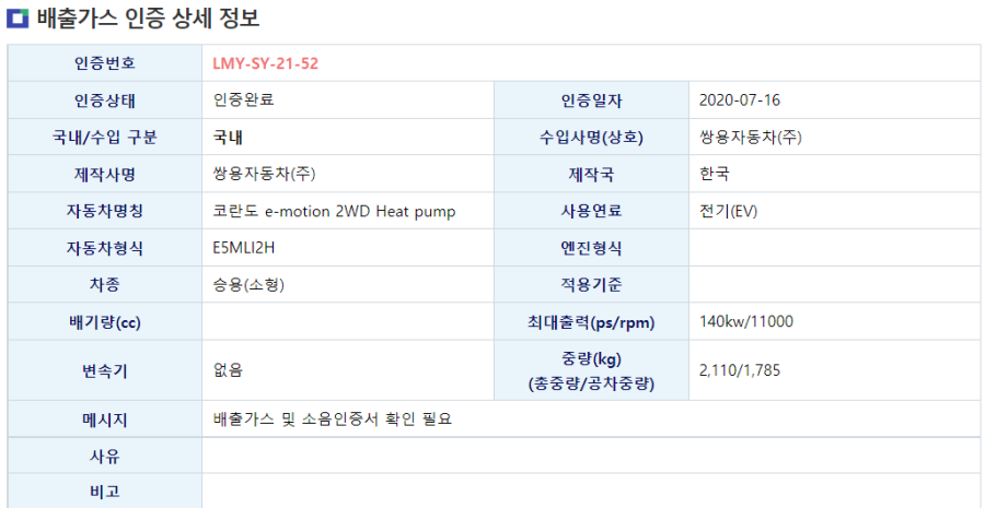 번호판에는 코란도가 적혀 있고, 공식 이름은 코란도 이모션으로 확정이 된 거 같아요!