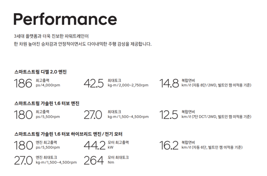 스포티지와 동일할 것으로 예상되는 투싼 엔진 스펙입니다.