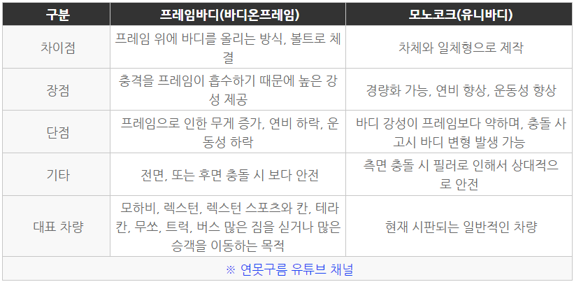 하지만 SUV의 역사라고 할 수 있는 지프도 그렇고, 사막의 롤스로이스라는 별명을 가진 랜드로버의 차량도 최근에는 유니보디 즉 모노코크로 제작이 되고 있습니다.