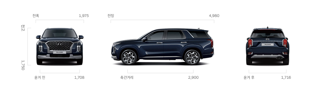 팰리세이드 전장은 4980mm로 2cm가 모자란 5미터이기 때문에 사실상 5미터로 보면 되겠죠?