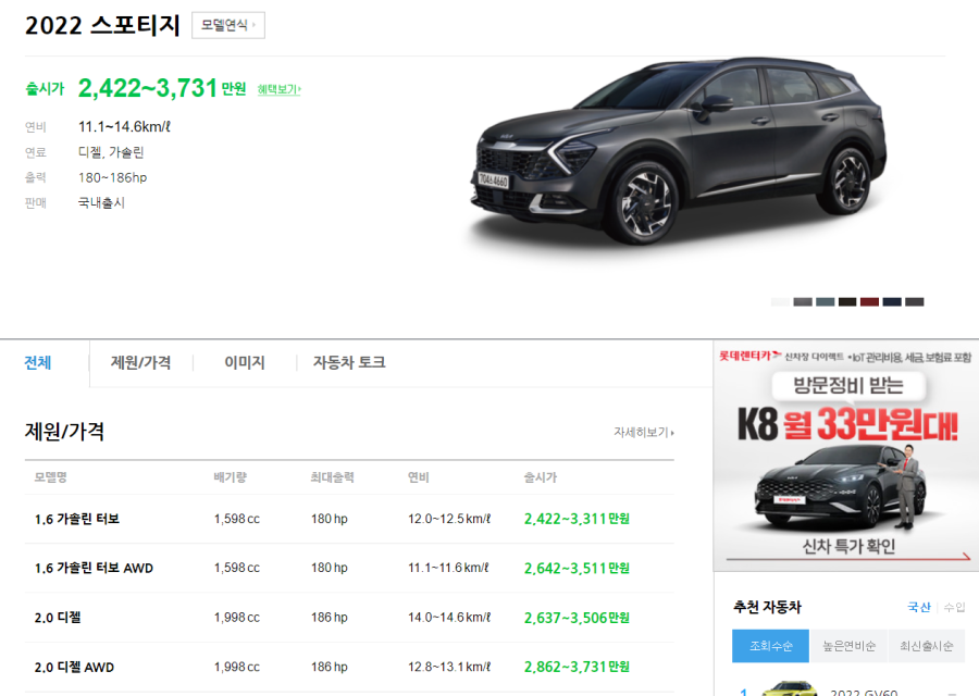 스포티지 가격은 2422~3731만 원으로 LPG 가격은 제조사의 공식 가격이 발표되지 않았기 때문에 가늠해야 하는 상황입니다.