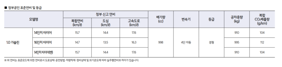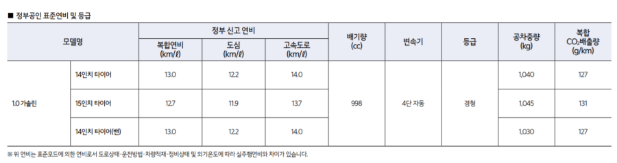 여기서 잘 보셔야 할 부분은 경차는 타이어 사이즈에 따라서 연비 차이가 큰 것을 알 수 있는데..