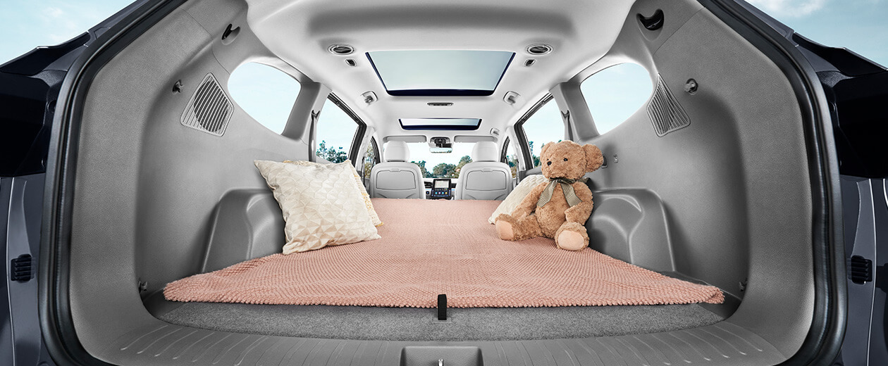 2열을 여유롭게 사용하면서 이 정도의 공간이라면 대형 SUV보다도 많은 용품을 수납할 수 있기 때문에 캠핑과 같은 환경에서 유용합니다.