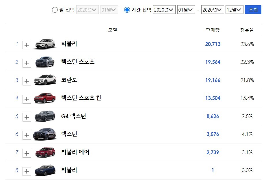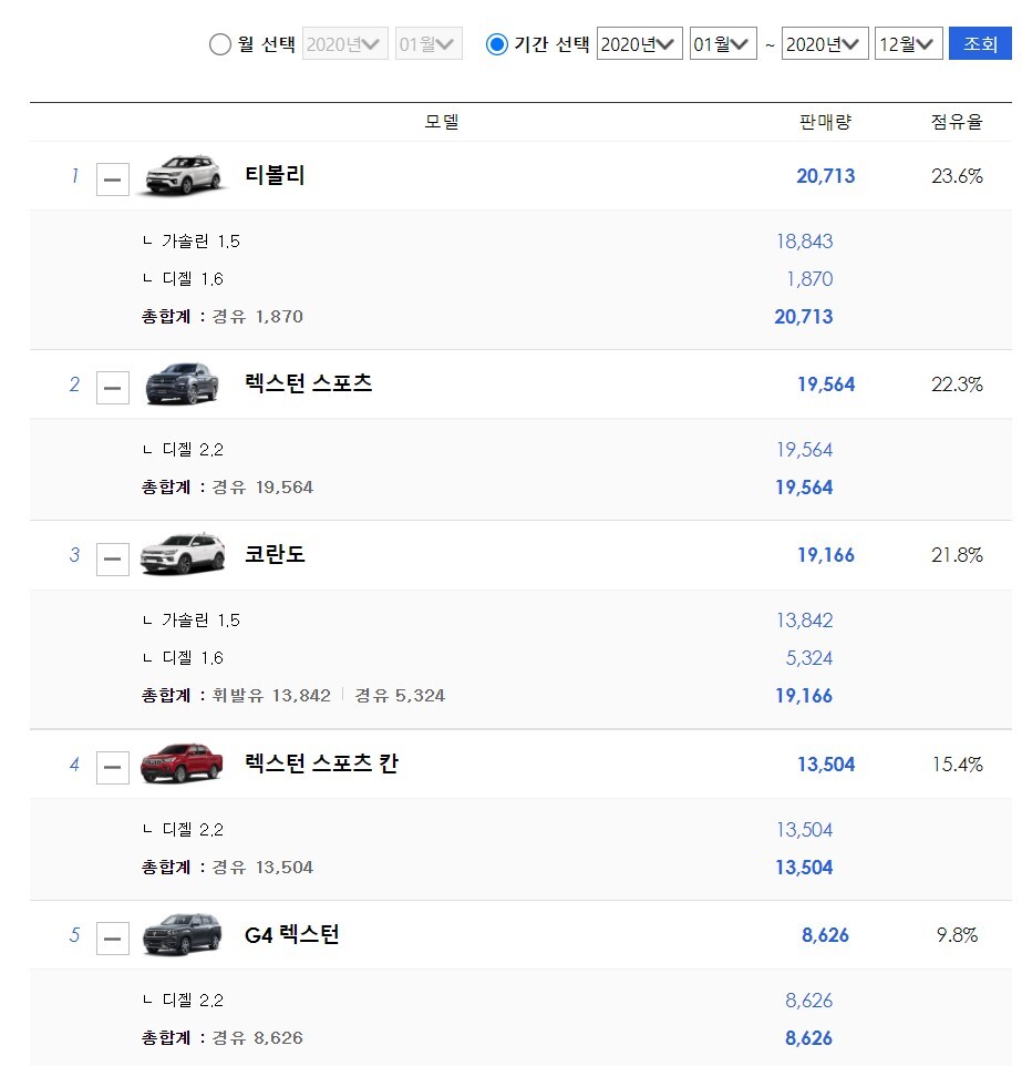 다나와 판매량 자료인데 쌍용차의 매출의 대부분이 3개의 차량에서 대부분 발생이 되고 있습니다.