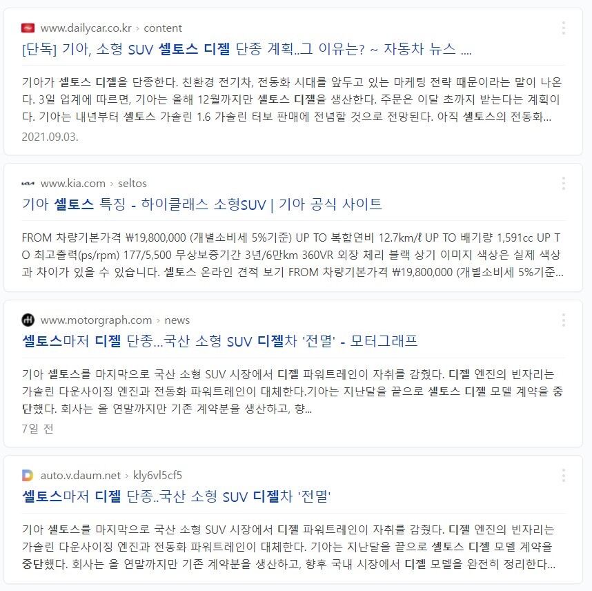 이 과정에서 내연 기관 엔진은 디젤이 가솔린 엔진보다 먼저 빠르게 사라지고 있는데 소형 시장을 석권하고 있는 셀토스의 경우 최근 디젤 엔진이 단종되었습니다.